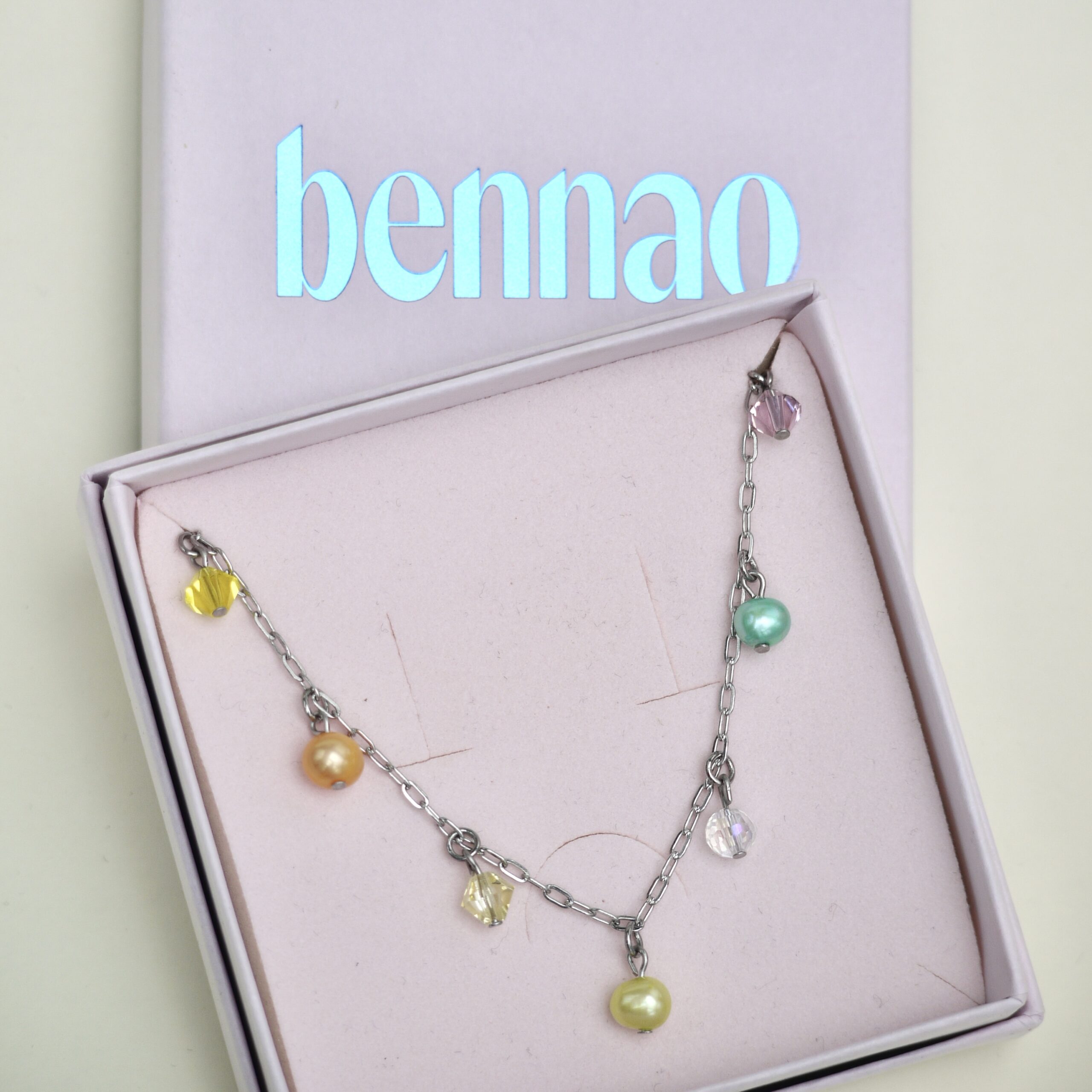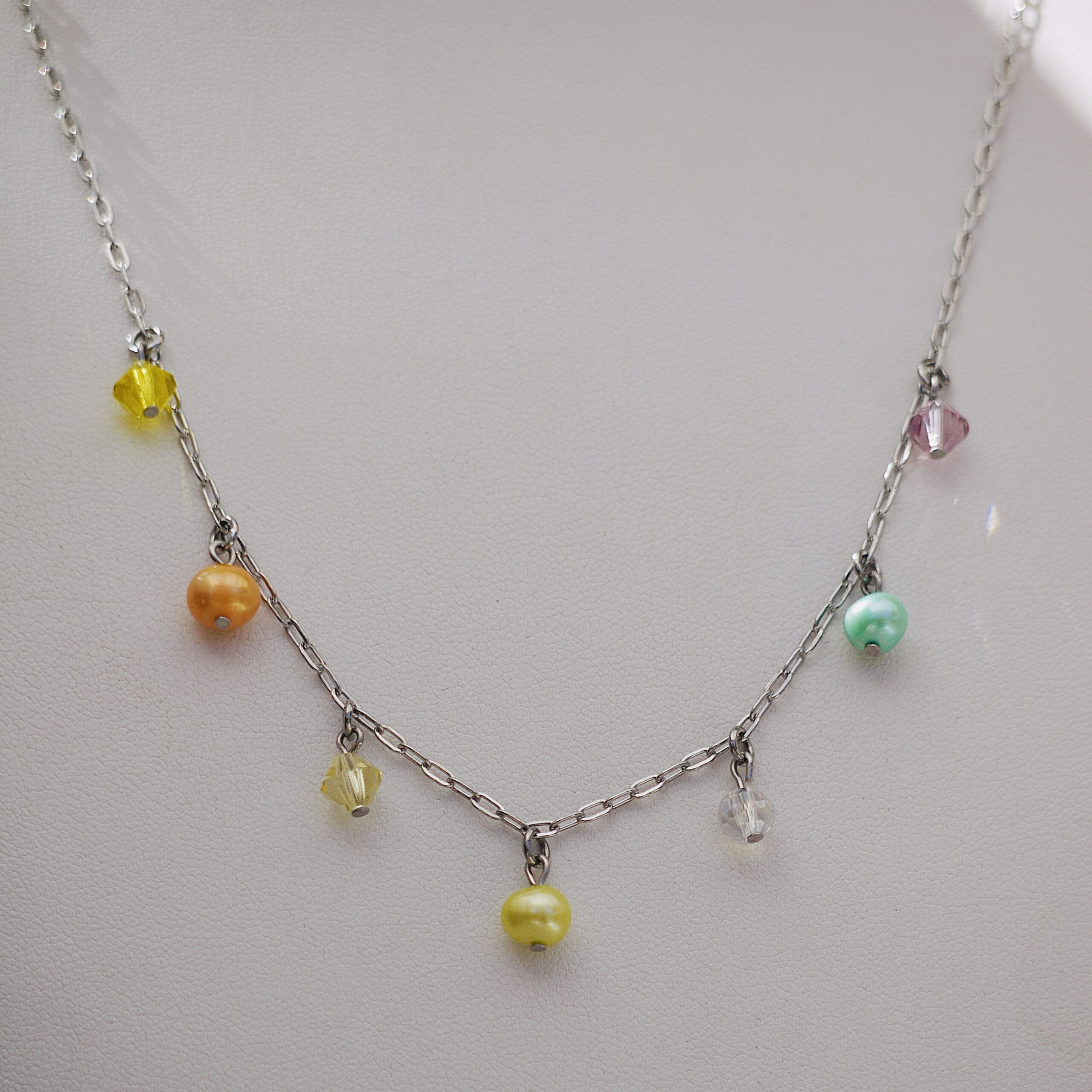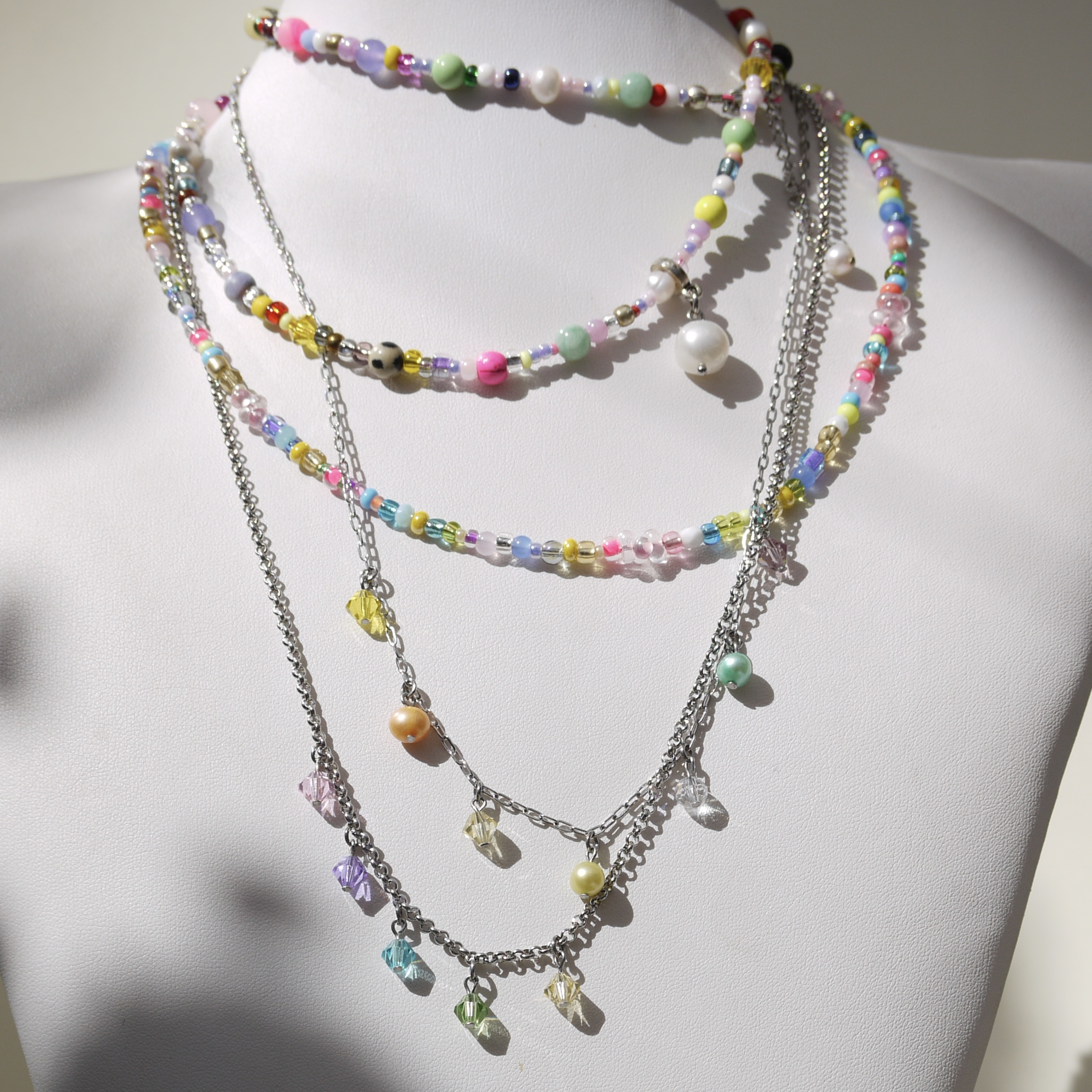 Herkkä sointu kaulakoru paperclip-ketjulla ja seitsemällä erilaisella helmellä. Helppo yhdistää muihinkin kaulakoruihin tai pitää yksinään.